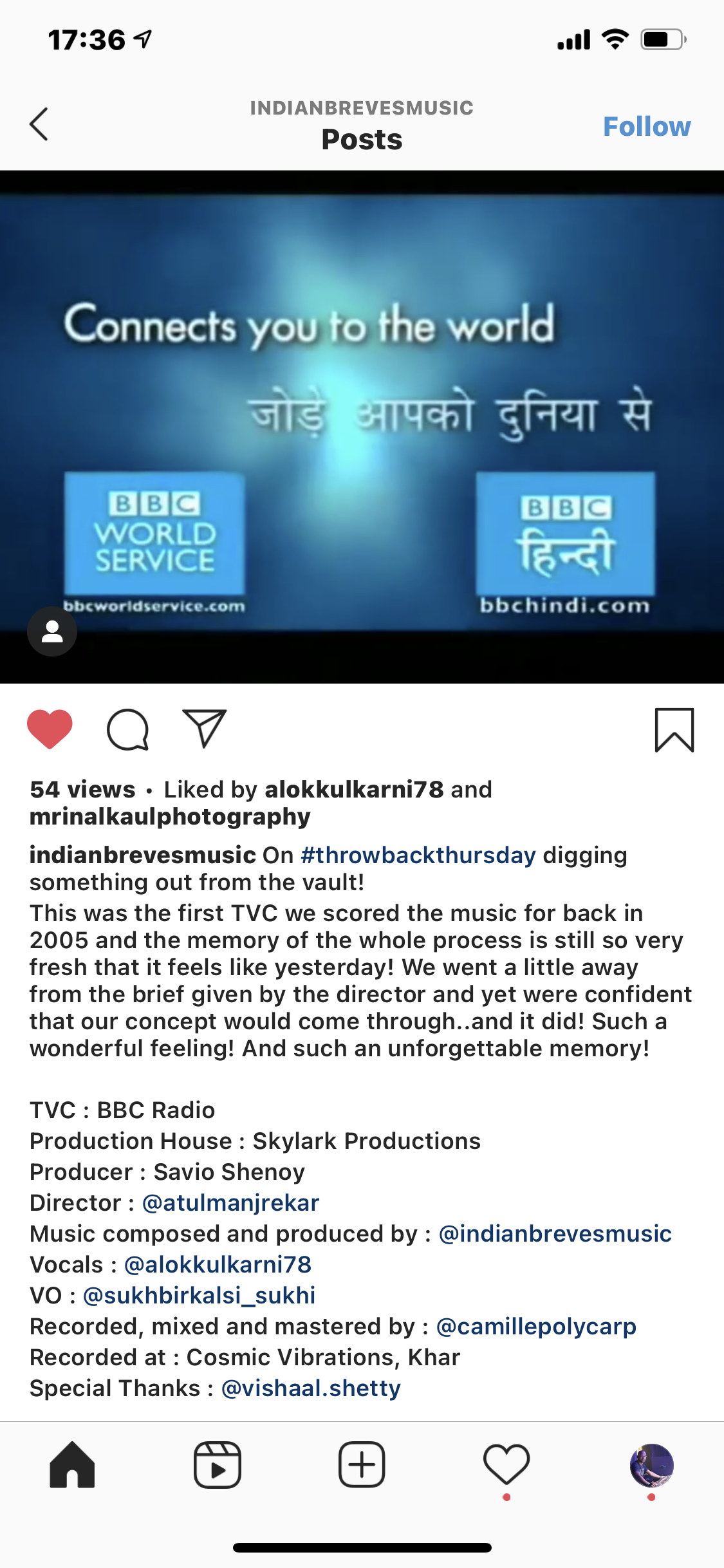 On this one, a most memorable blast from the past, sound-designed, recorded, mixed, and mastered by me at my studio in 2005. This was a television commercial for BBC Radio in Hindi.